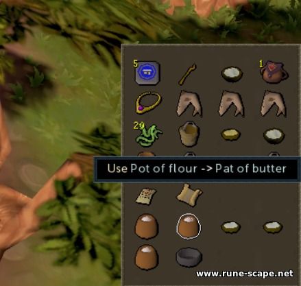 3. Вернитесь к шеф-повару в Гильдии Поваров, и он попросит у вас горшочек сливок и печенья , а также даст вам список ингредиентов для чизкейка . Баночки со сливками можно купить в магазине или приготовить из маслобойки с ведром молока. Горшок с мукой участники могут купить у Ромили Виклакс , которая находится рядом с шеф-поваром . Объедините горшок муки и кусочек сливочного масла , чтобы получить бисквитное тесто: