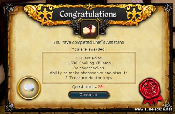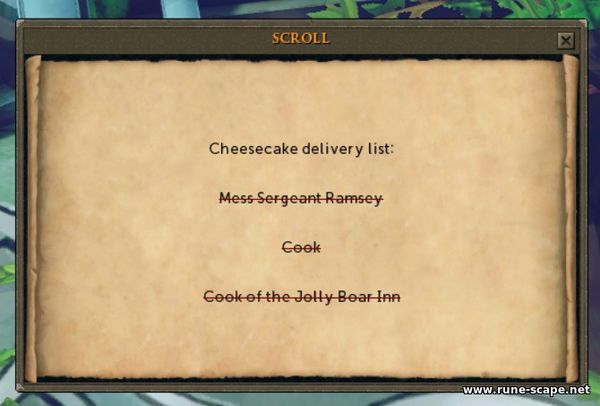 Рat of butter можно купить в подвале замка Ламбридж в кулинарном сундуке (Culinaromancer's Chest) или сделать самостоятельно, имея 38 уровень навыка Cooking. На крайний случай можно поговорить снова с шеф-поваром и он продаст его вам за 50 монет. Сake tin (форма для торта) можно найти на втором этаже Гильдии Поваров. При наличии всех необходимых ингредиентов, нужно снова поговорить с шеф-поваром.