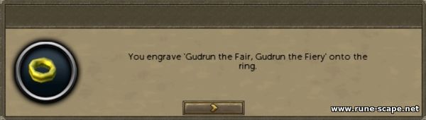 3. Несем кольцо обратно Дорорану. Он попросит вас выгравировать на кольце надпись «Гудрун прекрасная, Гудрун огненная» . Нажмите на кольцо, чтобы выгравировать его, и покажите Дорорану выгравированное кольцо Дорорана. Оно ему понравится, и он захочет, чтобы вы отдали его варварке Гудрун.