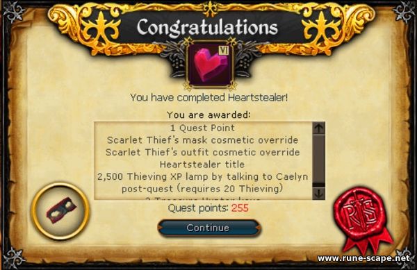 1. Поднимитесь на верхний этаж дома и поговорите с Caelyn Kadaan или Annette Kadaan. Аннет скажет вам, что Кэлин больше не получает удовольствия от воровства, поскольку совершает только мелкие кражи, предполагая, что более сложное ограбление поднимет ей настроение. Затем Аннет телепортируется, а Кэлин расскажет вам о предстоящем гала-концерте, который пройдет в музее Варрока в честь дарения рубина в форме сердца. Она просит вас помочь ей украсть рубин. После согласия вам предстоит выполнить три задания для подготовки к ограблению.