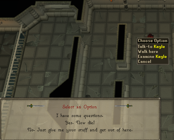 Идём на север от входа в направлении жёлтой точки, Kayle, имеет всего 20 хп, атакует рэнджем, убиваем его, на последнем исдыхании о молит о пощаде, в диалоге можно выбрать либо "Да, умри, жывотнае!", либо "Нет, отдай мне свои вещи и в Бабруйск, жывотнае!".