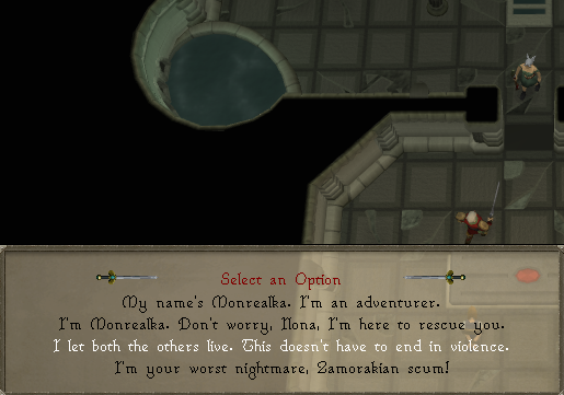 Reese тоже имеет 20 хп и бьёт мелее. Так же как и с предыдущими, выбираем в диалоге или мы хотим его прикончить или забрать его вещи и дать уползти восвояси. Подбираем его мечь и развязываем Ilona, которая находится в той-же комнате. (Если пошли развязывать Иллону до того, как поднять мечь, не пытайтесь возвращаться в катакомбы, там уже ничего нет.)